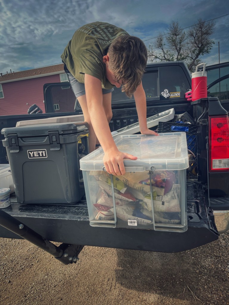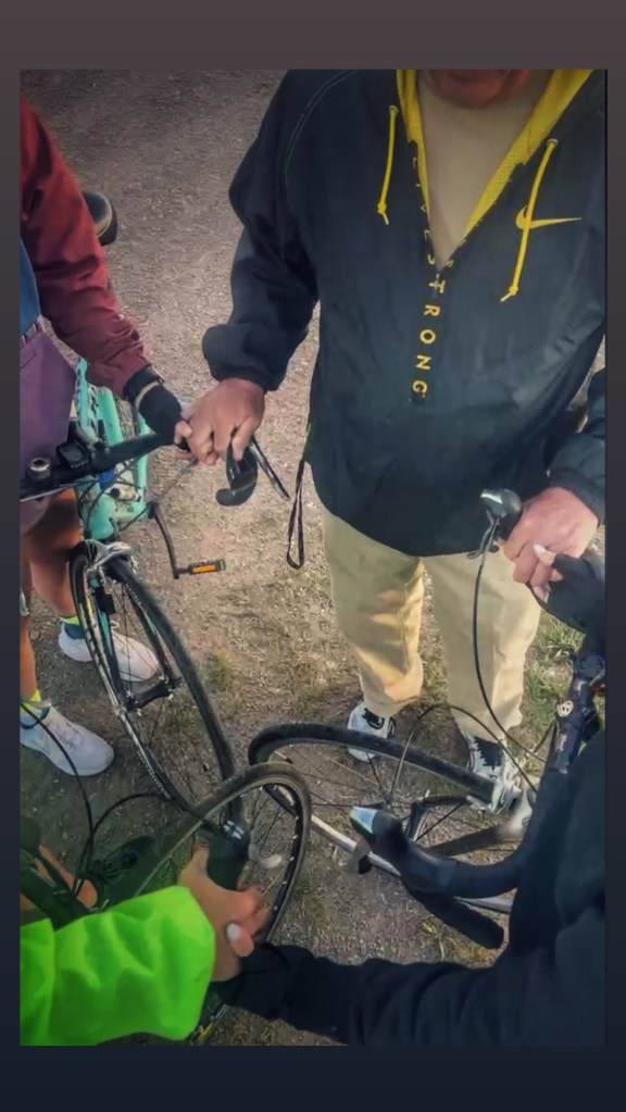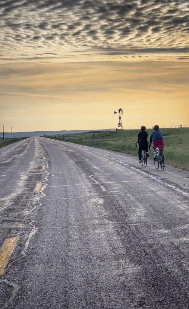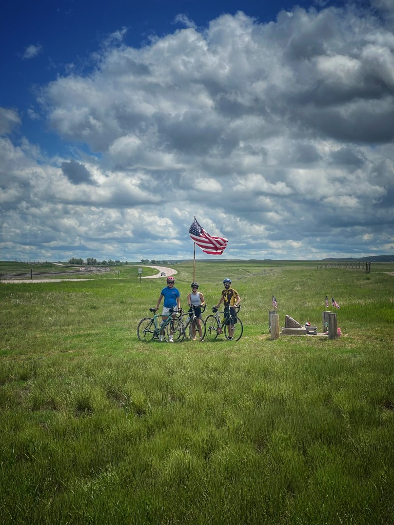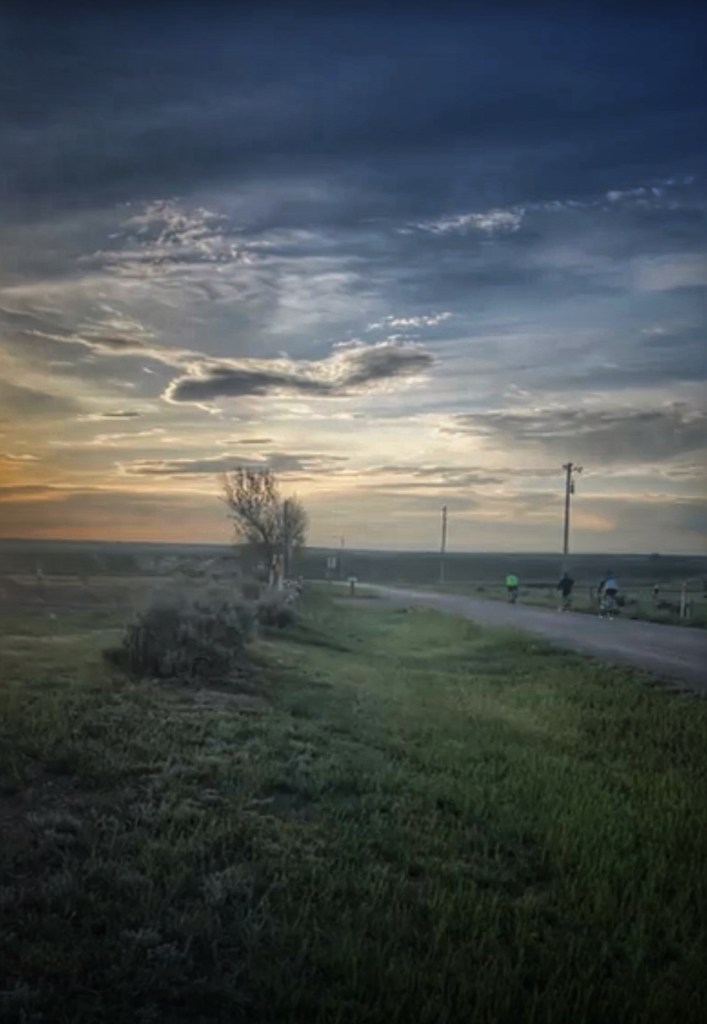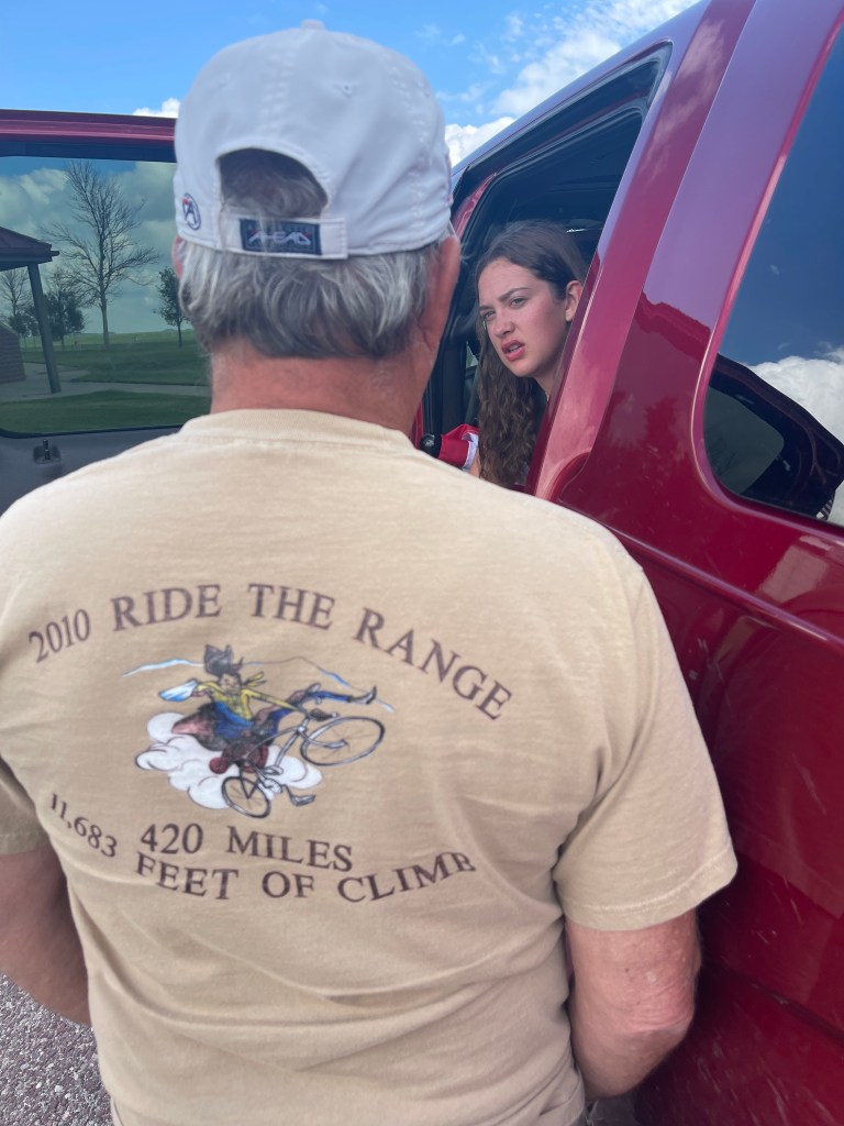 Ride the Range 2023 started early this morning. This year we are sticking close to home and will ride throughout Wyoming. Today the riders wrapped up 108 miles. The riders this year are Tom and his two daughters, Lucie and Lilli. In the support vehicle we have Tom’s wife, Stephanie, and the girls’ mom, Havely. Their little brother, Lane, will be hauling coolers and food tubs – ensuring the riders stay hydrated and have plenty of energy! This morning the mood was positive and light as the journey began. Today’s ride will be a relatively safe ride with little traffic and a good shoulder. Beautiful views are always in the works. Patriarch of the family, Keith (aka Pops), met the group before the set out to get in the first morning prayer of the ride.
