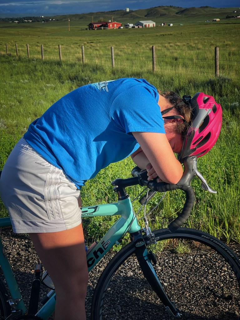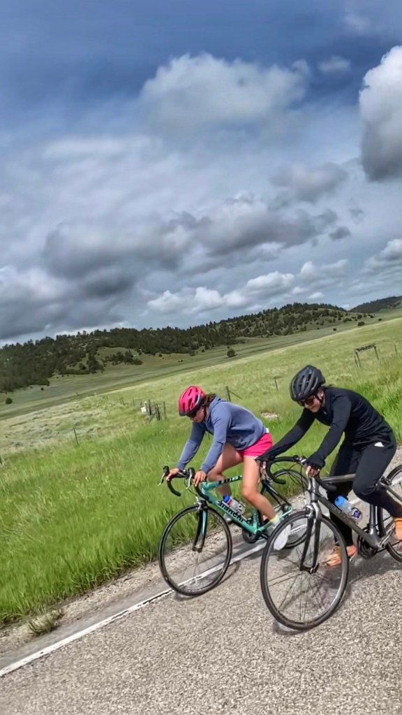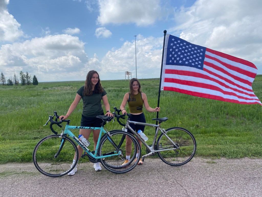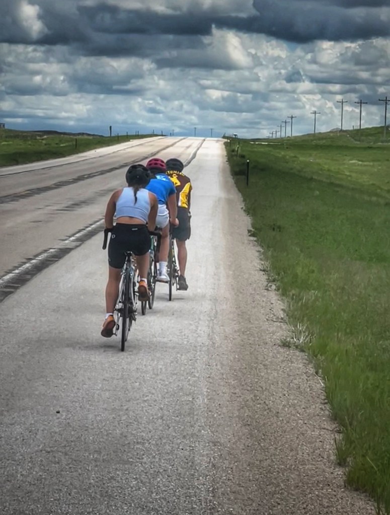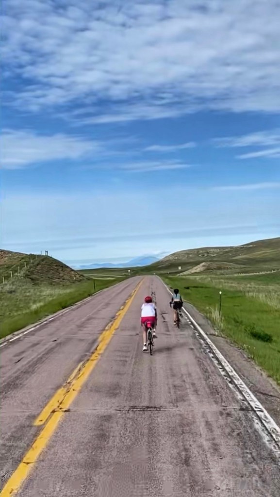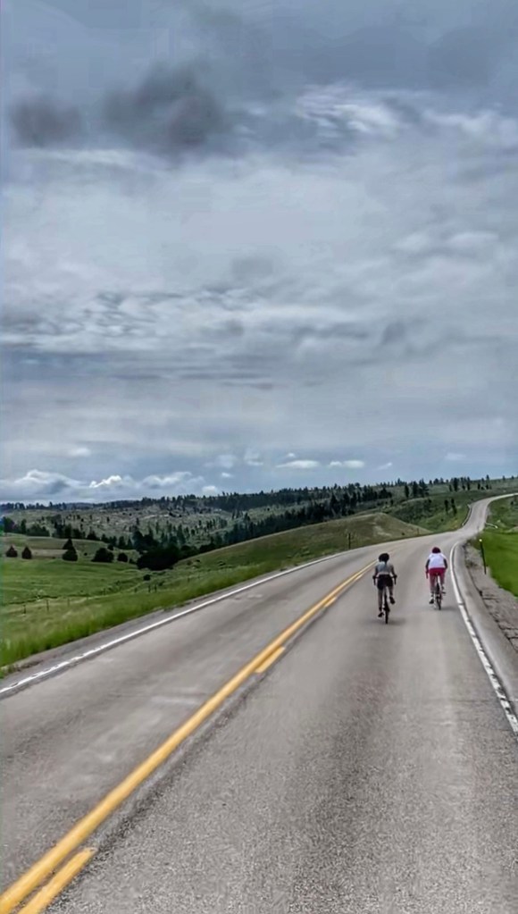 Today the girls rode solo. Tom and Steph had to travel to South Dakota for a half marathon…so Steph contributed by foot in the half marathon and Tom rode the trails of the Black Hills. Lucie and Lilli had a beautiful ride here in Wyoming, accumulating 100 miles. Today took us through a scenic area, lots of hills and parts of a canyon. The shoulder wasn’t too wide, so the support vehicle stuck close. Overall, the girls did great on their first solo ride!